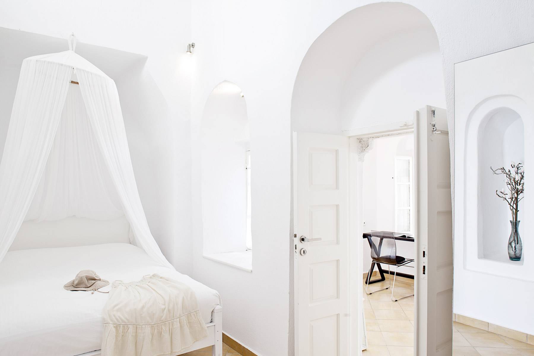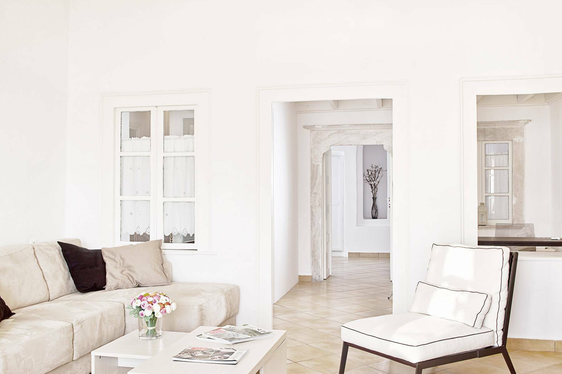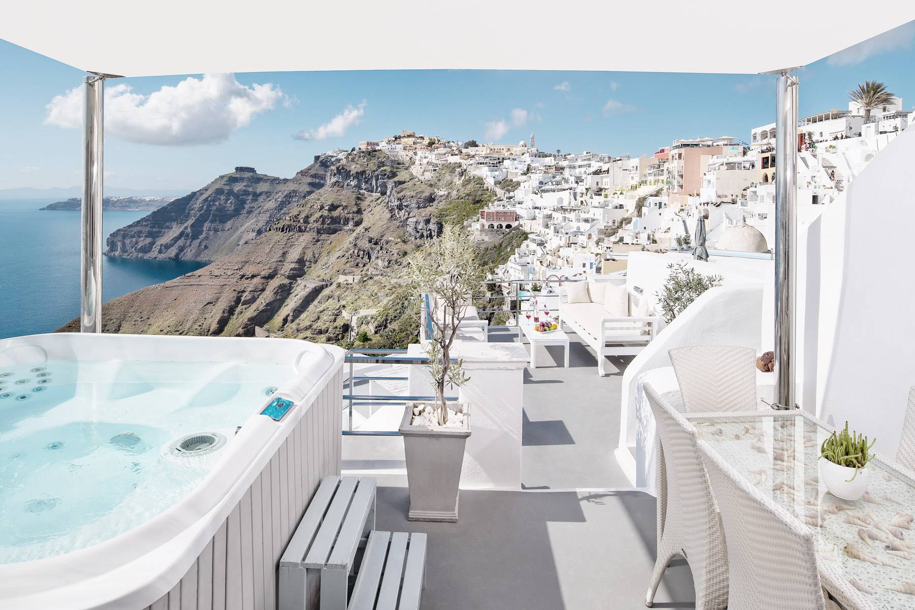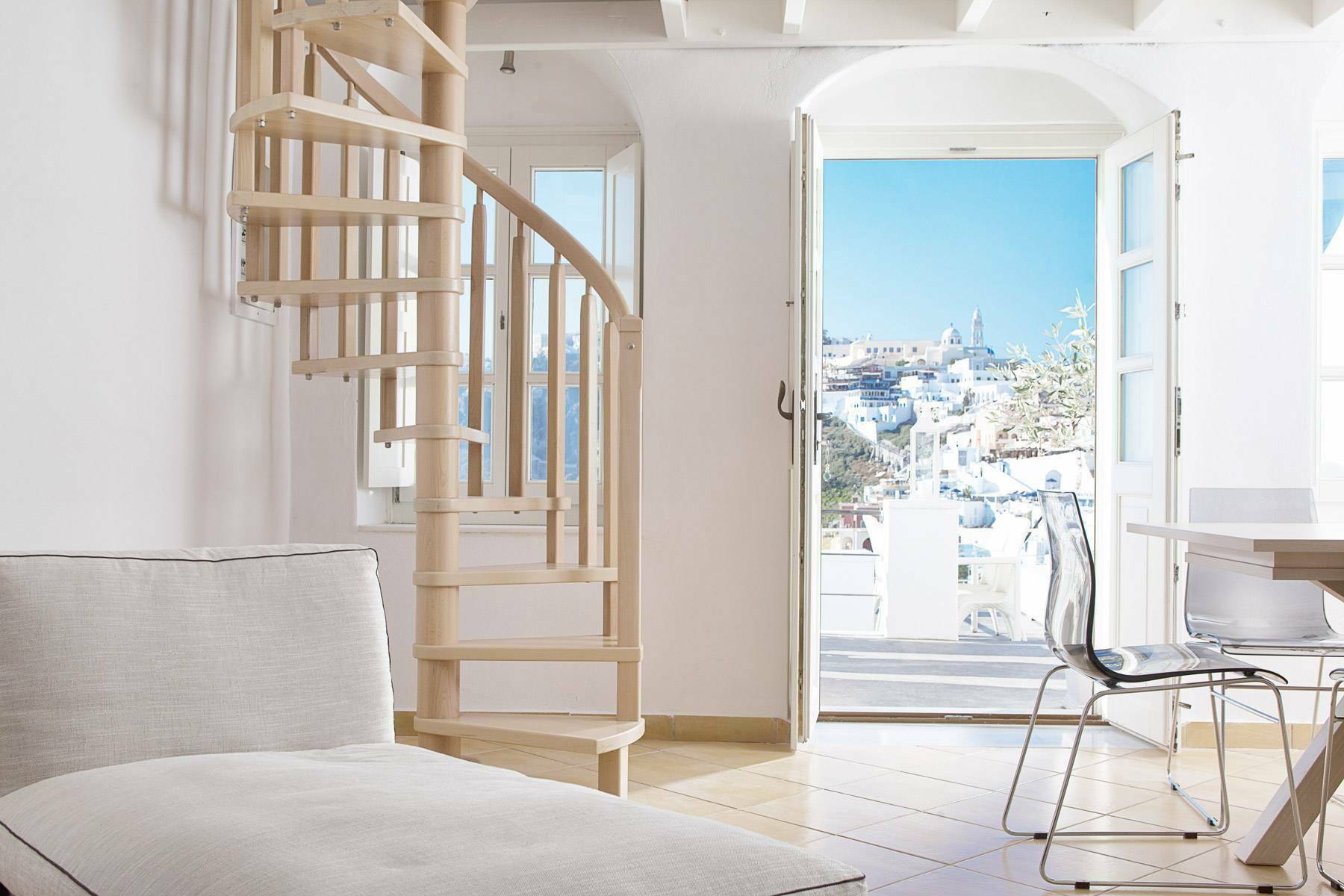 The elegant residence is set on the rim of the caldera cliff in the capital town of Fira. Its privileged location and orientation offers panoramic breathtaking views to the sea, the volcano and the picturesque town of Fira, while it provides easy access to the town